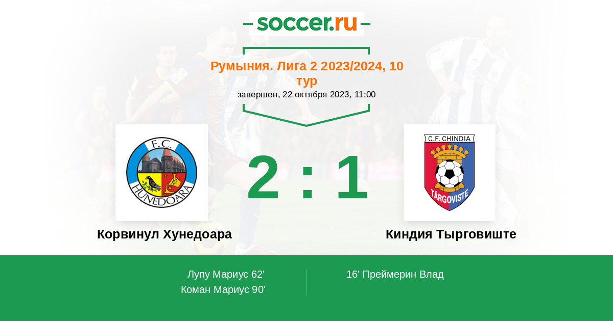 Протокол матча Корвинул Хунедоара против Киндия Тырговиште