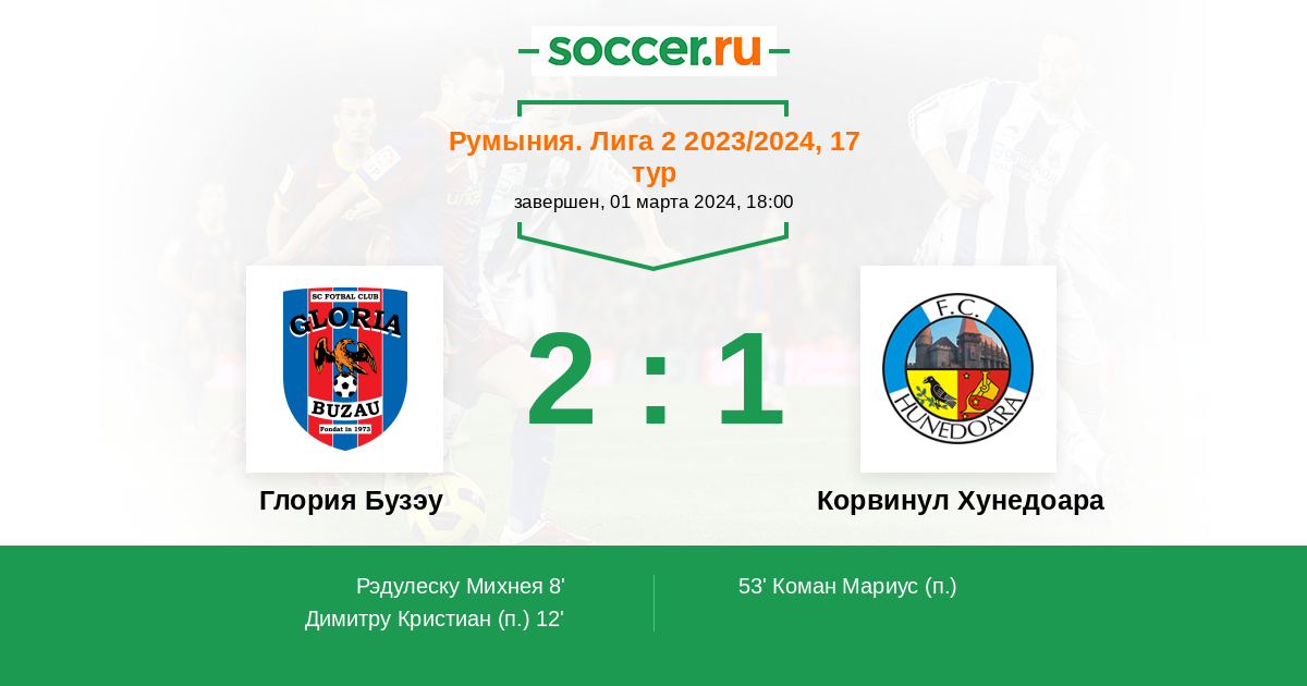 Протокол матча Глория Бузау против Корвинул Хунедоара