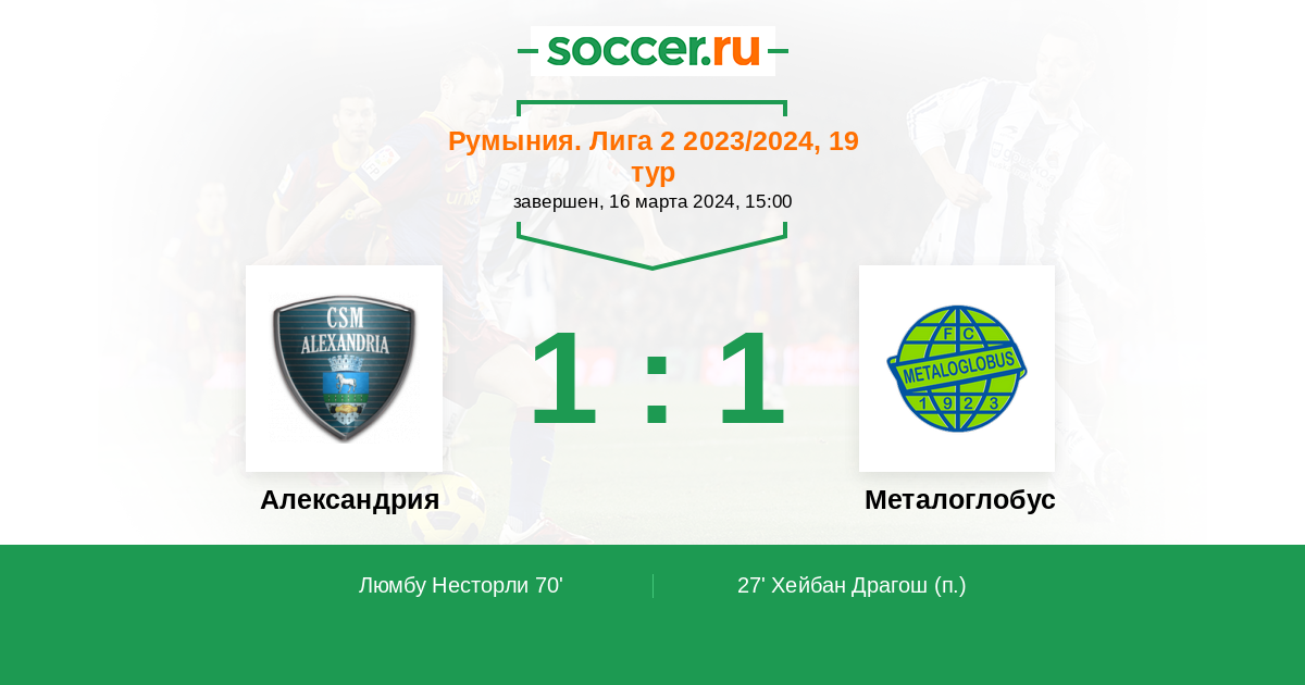 Протокол матча Александрия против Металоглобус