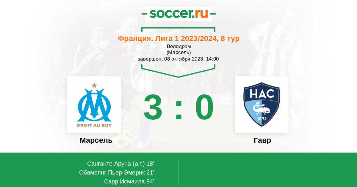 В предстоящем матче 8 - го тура французской Лиги 1 между командами Олимпик Марсель и Гавр, фаворитом на победу является команда хозяев Олимпик Марсель, так как игра пройдёт на стадионе Велодром.