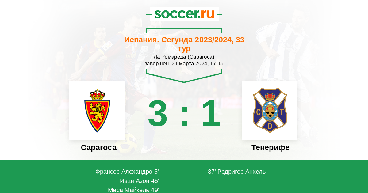 Протокол матча Сарагоса против Тенерифе