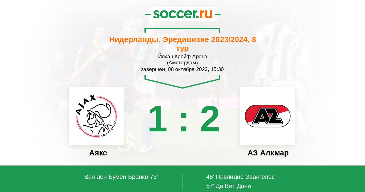 Я думаю что в этом противостоянии более чем явным фаворитом на победу выглядит команда гостей АЗ АЛКМАР . Команда хозяев поля Аякс что-то совершенно не впечетляет своей игрой в начале этого сезона и занимает аж одинадцатую строчку турнирной таблицы . А команда гостей не проиграла ни одного матча и находится на втором месте . Победа гостей и ТБ 2.50 .