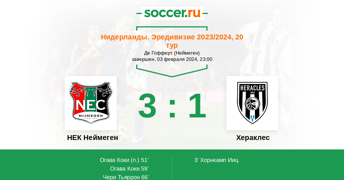 В матче голландского Эредивизие между командами Нек Неймеган и Хераклес смею предположить победу хозяев, потому как на их стороне преимущество своего поля и плюс гораздо результативнее атака и надёжнее оборона.