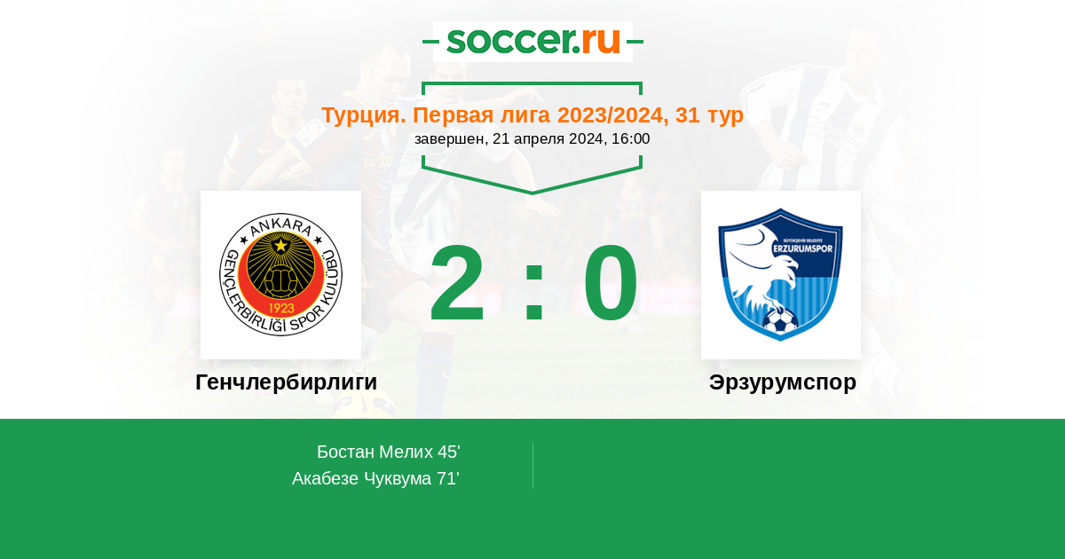 71' (2:0) Акабезе Чуквума (88) (Кемалоглу Энсар (20))