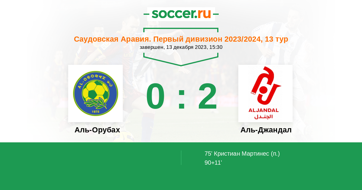 Аль-Орубах - два поражения подряд... Сегодня встречаются с Аль-Джандал, командой которая не тушуется в игре и с лидерами, например Аль-Адалх (ничья) Но в данной встрече , если в команде "гигантов" нет противоречий с тренером, хозяевам надо брать 3 балла.
