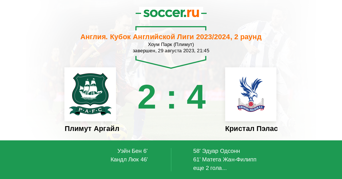 Протокол матча Плимут Аргайл против Кристал Пэлас