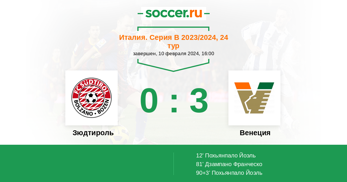 Протокол матча Зюдтироль против Венеция