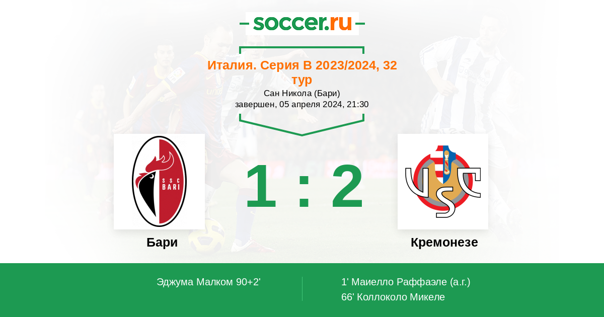 Протокол матча Бари против Кремонезе