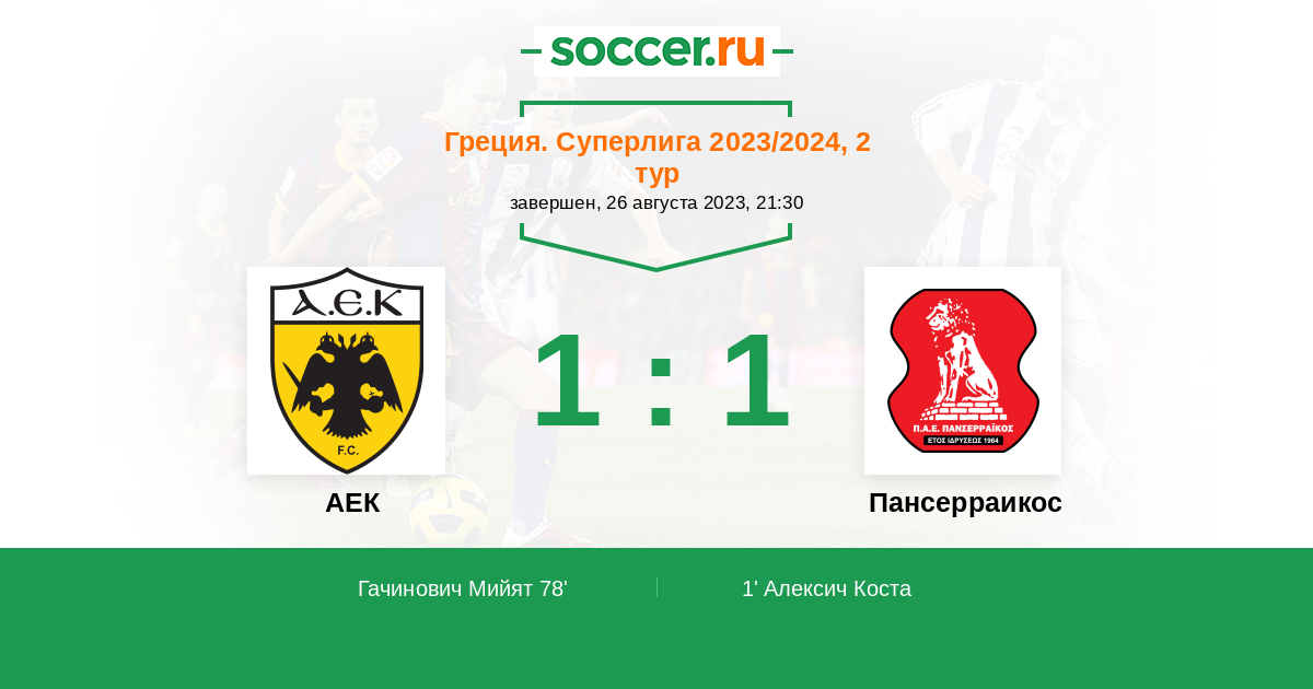 1' (0:1) Алексич Коста (14) (Пилеас Костас (2))