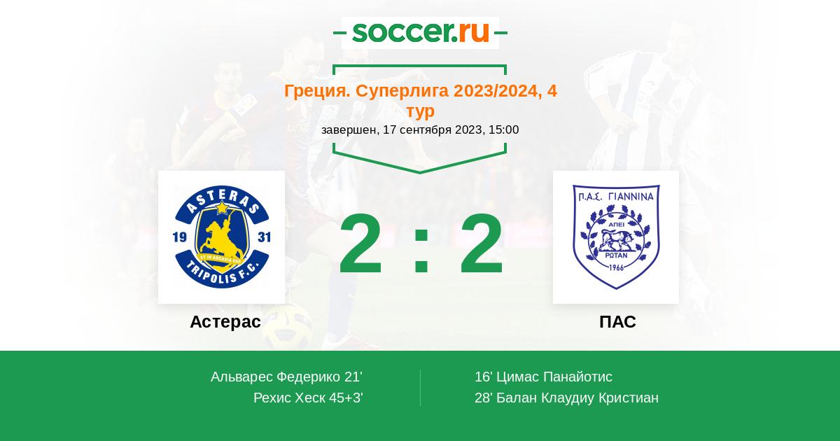 16' (0:1) Цимас Панайотис (21) (Сория Карлес (2))