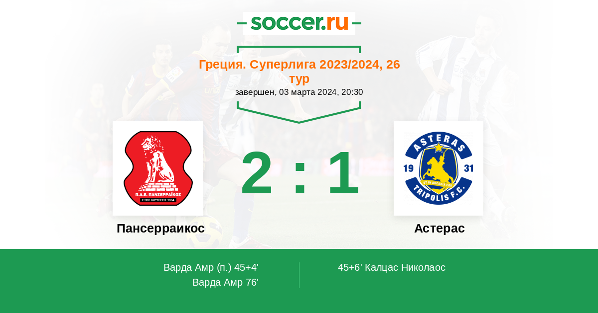 Протокол матча Пансерраикос против Астерас