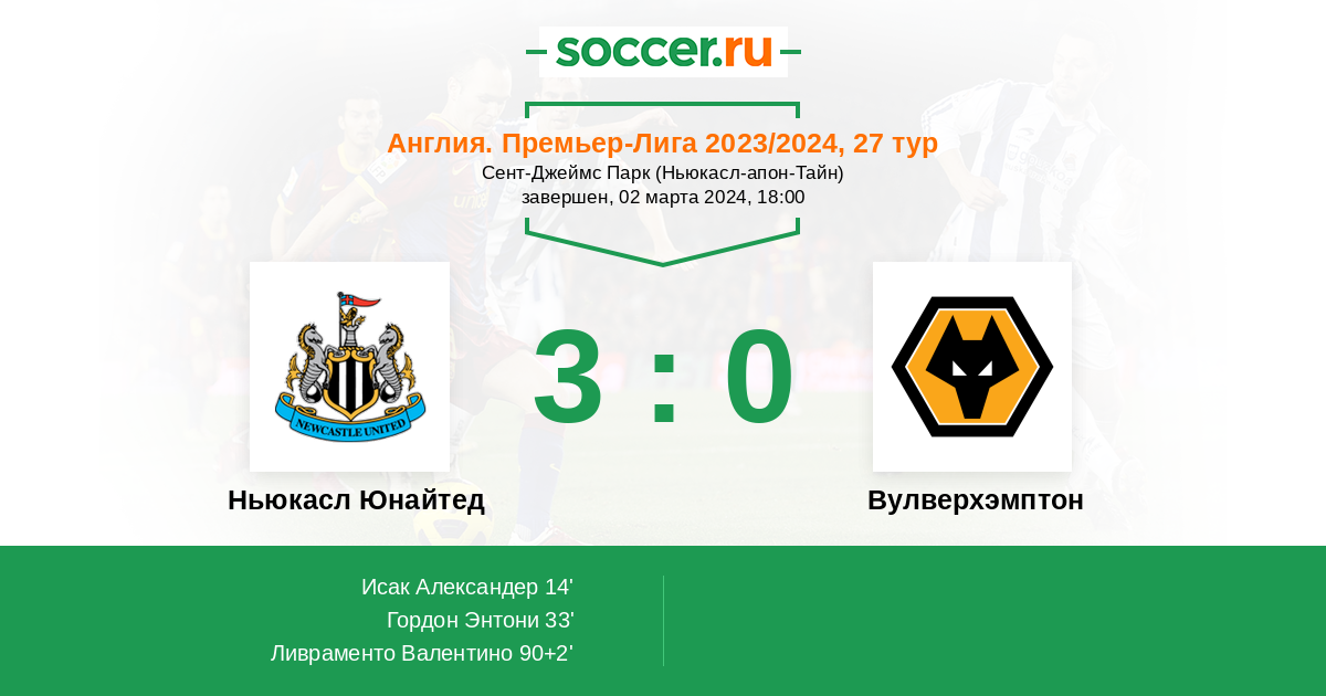 Протокол матча Ньюкасл Юнайтед против Вулверхэмптон
