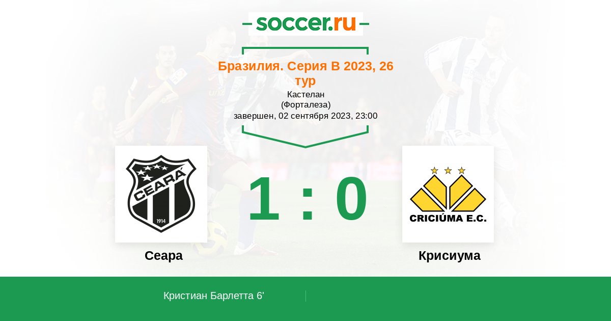 6' (1:0) Кристиан Барлетта (30) (Эрик (11))