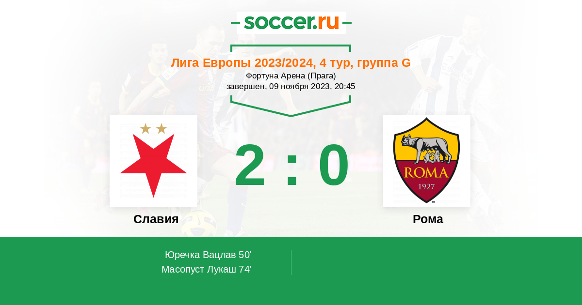 Гости добыли девять очков, а хозяева – шесть. У их соперников по группе – “Шерифа“ и “Серветта“ – всего по одному баллу на счету. Чешский и итальянский клубы близки к выходу из группы, шансы их соперников вмешаться в эту борьбу очень малы. “Славию“ вполне устроит ничья. "Рому" вряд ли. “Славия“ уйдет в оборону в поединке и будет играть на результат.