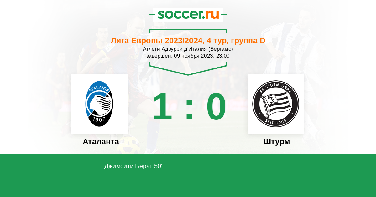 В предстоящем матче 4 - го тура Лиги Европы в группе Д между командами Аталанта Бергамо и Штурм Граз , более чем явным фаворитом на победу является команда хозяев Аталанта Бергамо.
