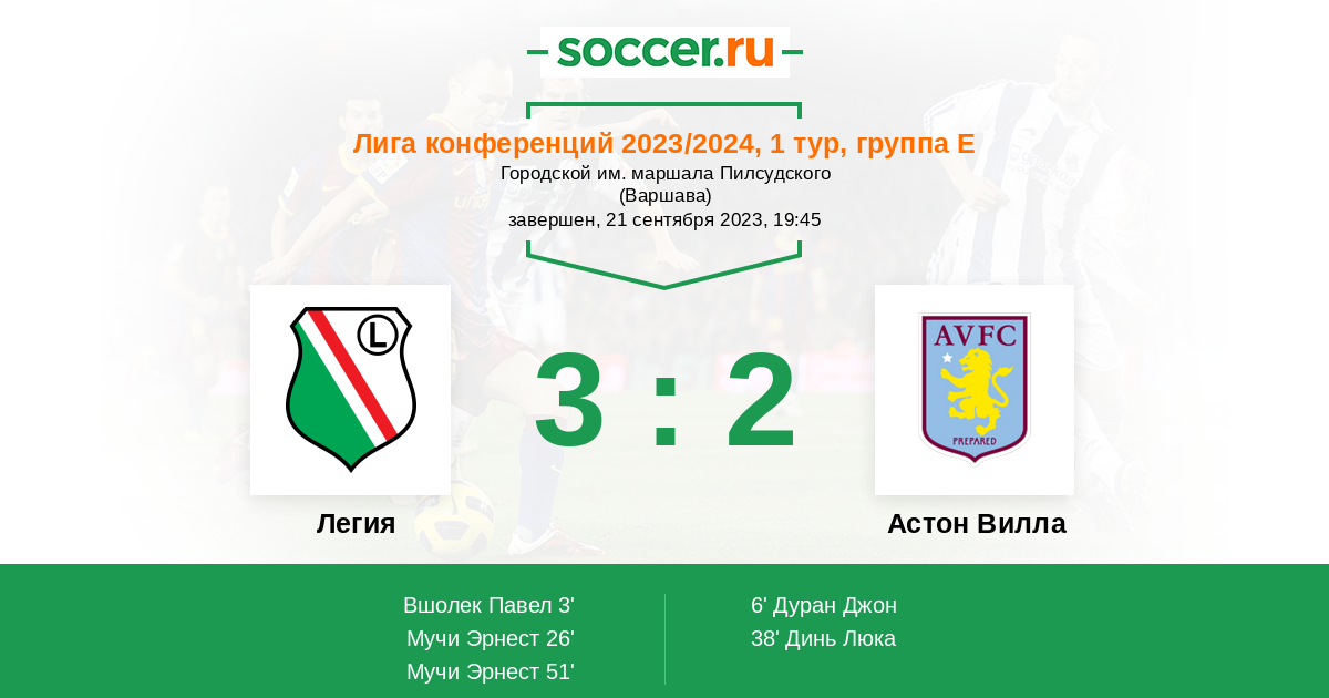 Протокол матча Легия против Астон Вилла