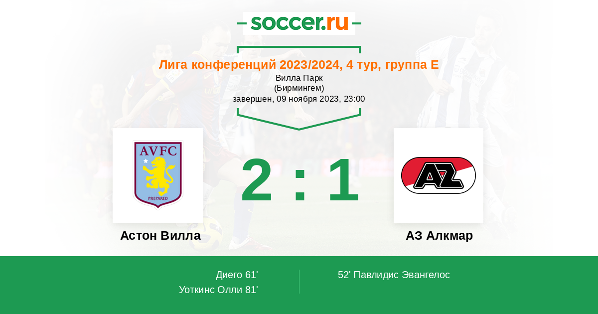 Я думаю что в этом противостоянии более чем явным фаворитом на победу является команда хозяев поля Астон Вилла . Да и первый матч между этими командами тому яркое подтверждение , где Астон Вилла разгромила в гостях АЗ АЛКМАР . Я думаю что и в этом матче будет что-то подобное . Победа хозяев поля и ТБ 2.50 .