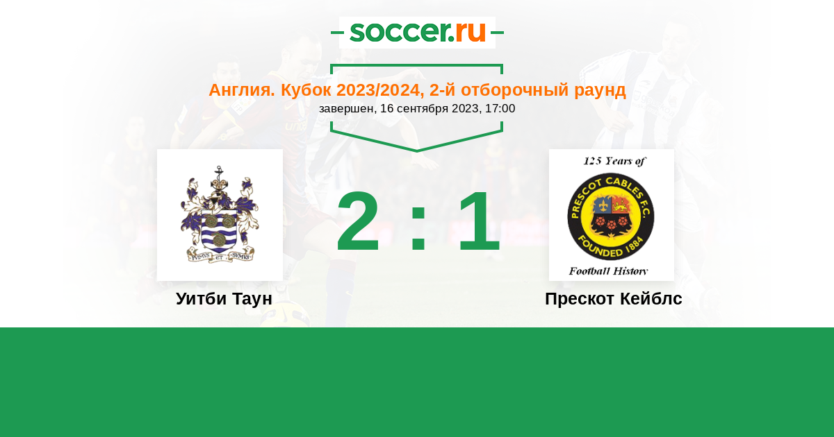 Англия. Кубок 18.09.2021 Прескот Кейблс Логотип футбольный клуб Прескот Кейблс 0:3 Логотип футбольный клуб Уитби Таун Уитби Таун