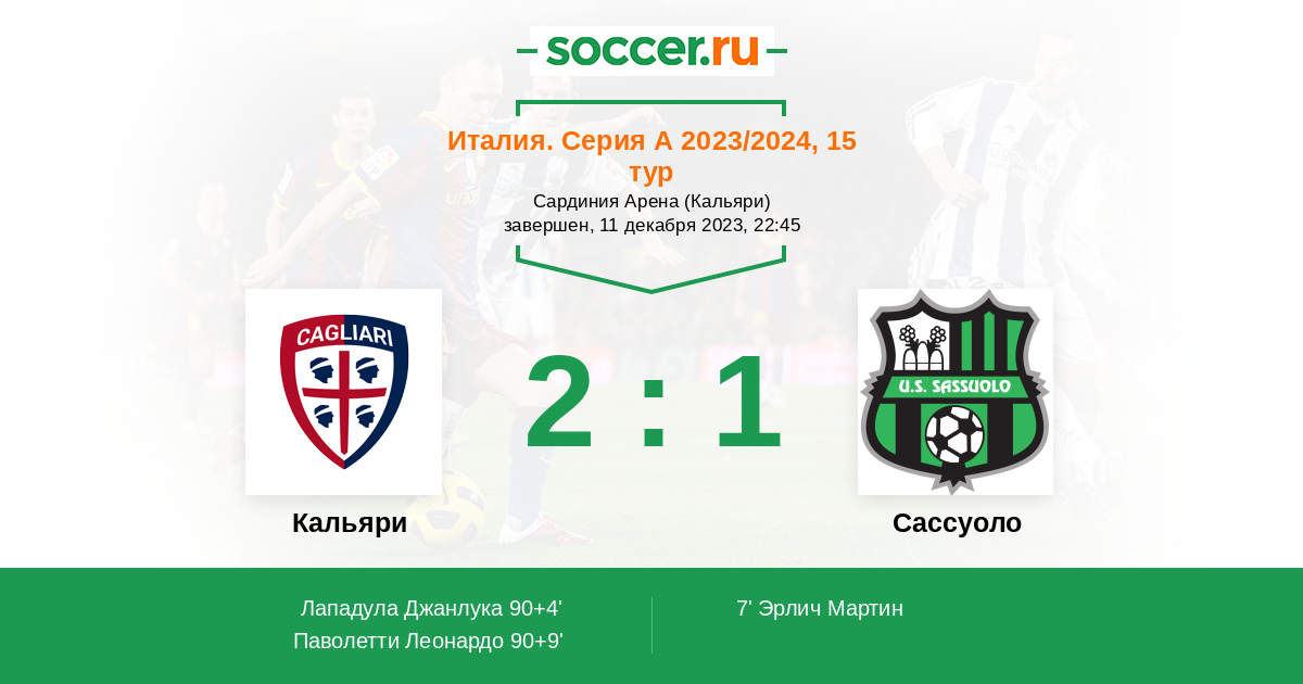 Протокол матча Кальяри против Сассуоло
