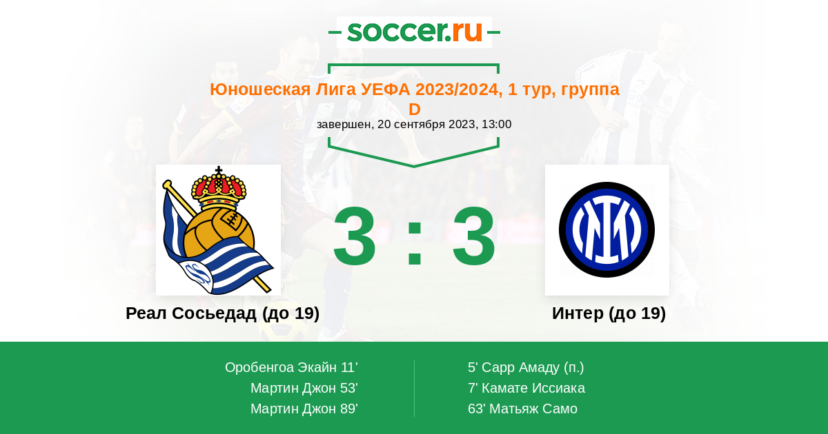 Протокол матча Реал Сосьедад (до 19) против Интер (до 19)