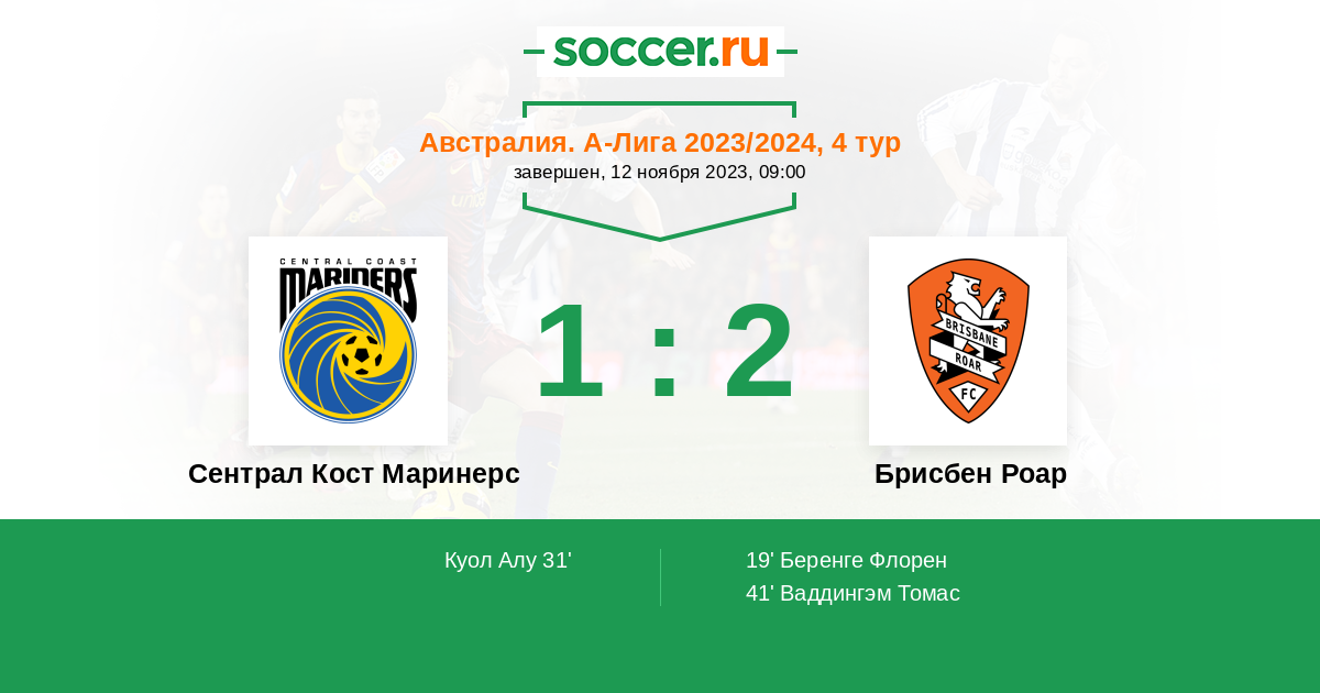 Протокол матча Сентрал Кост Маринерс против Брисбен Роар