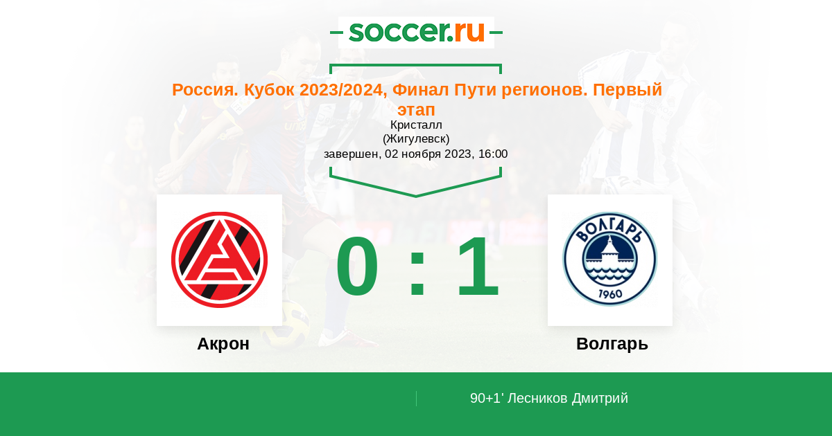 Волгарь ко всему прочему один из аутсайдеров лиги и отвлекаться на кубок им нет резона, поэтому Акрон победит и продолжит путь в турнире