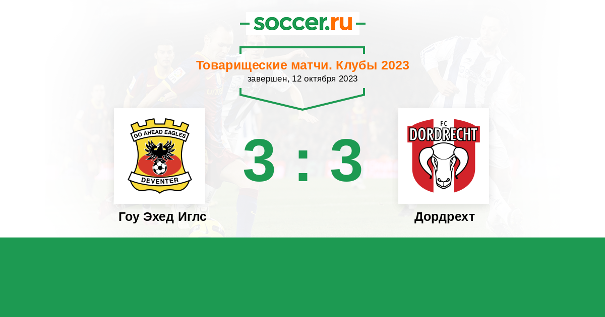 Нидерланды. Первый дивизион 26.10.2012 Гоу Эхед Иглс Логотип футбольный клуб Гоу Эхед Иглс (Девентер) 0:2 Логотип футбольный клуб Дордрехт Дордрехт