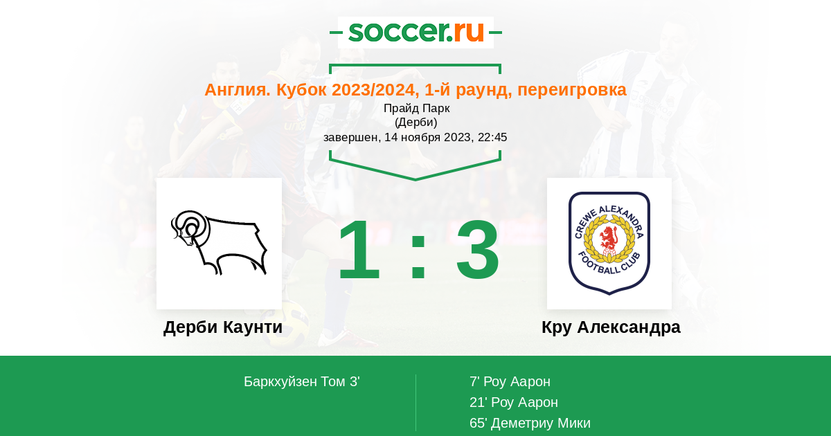 Протокол матча Дерби Каунти против Кру Александра