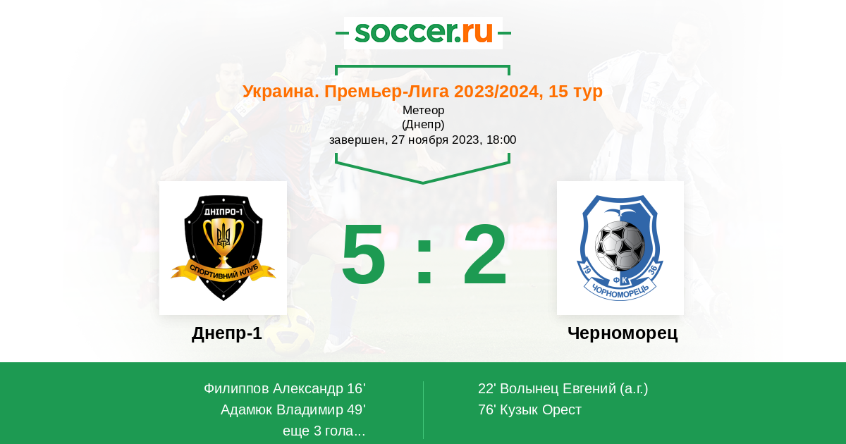 Протокол матча Днепр-1 против Черноморец