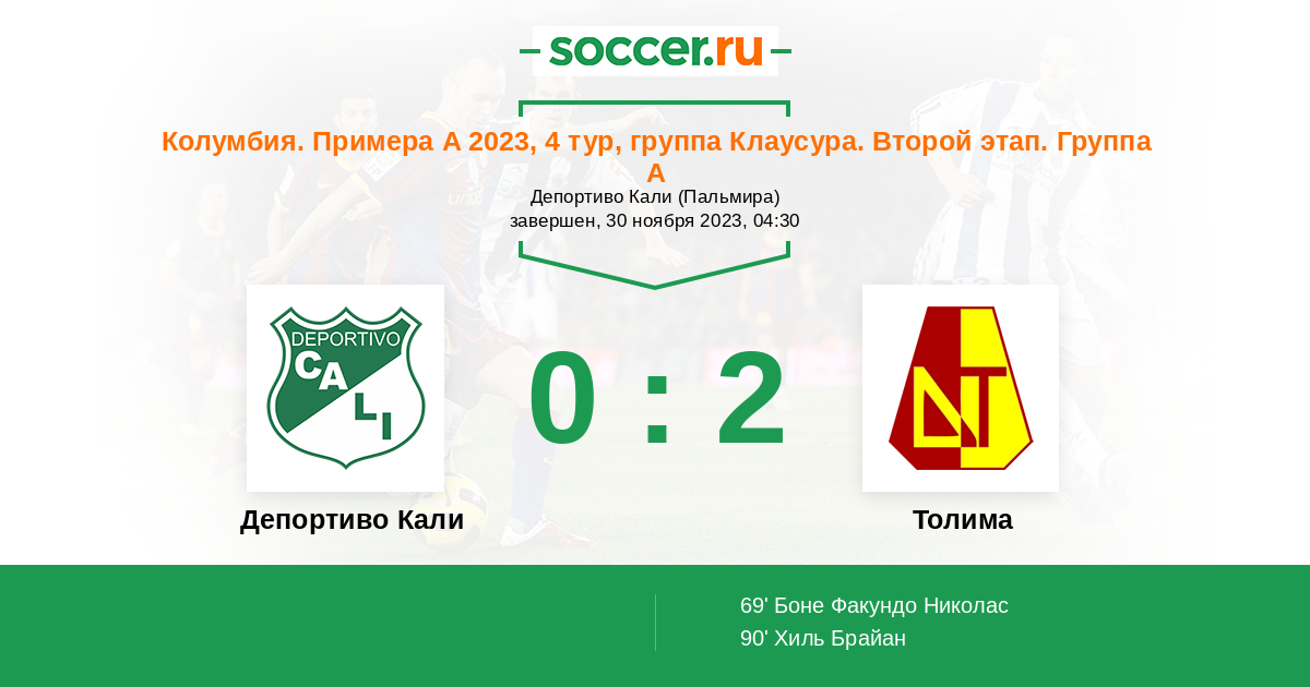 Протокол матча Депортиво Кали против Толима