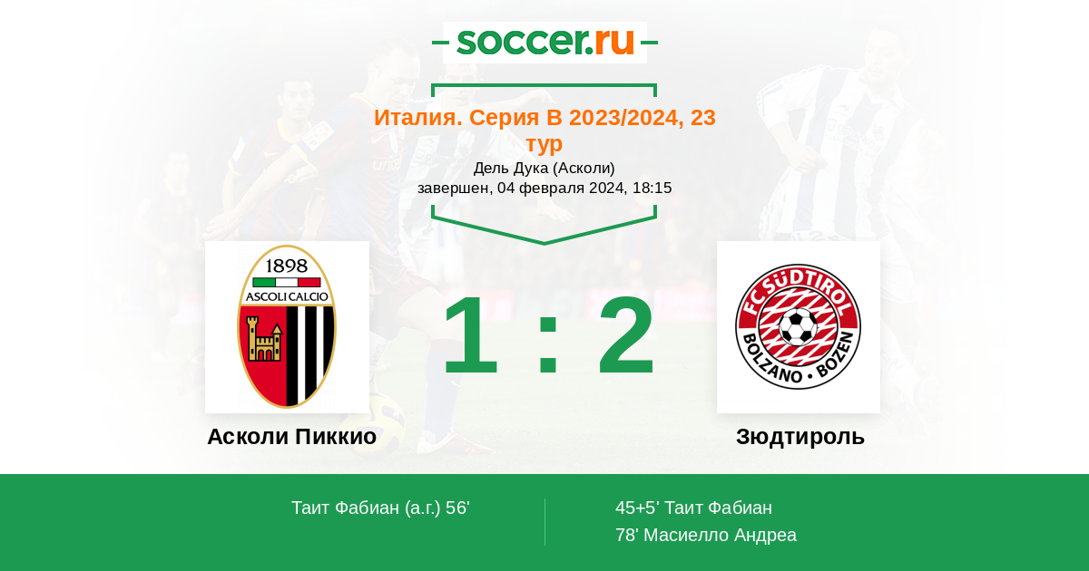 Протокол матча Асколи Пиккио против Зюдтироль