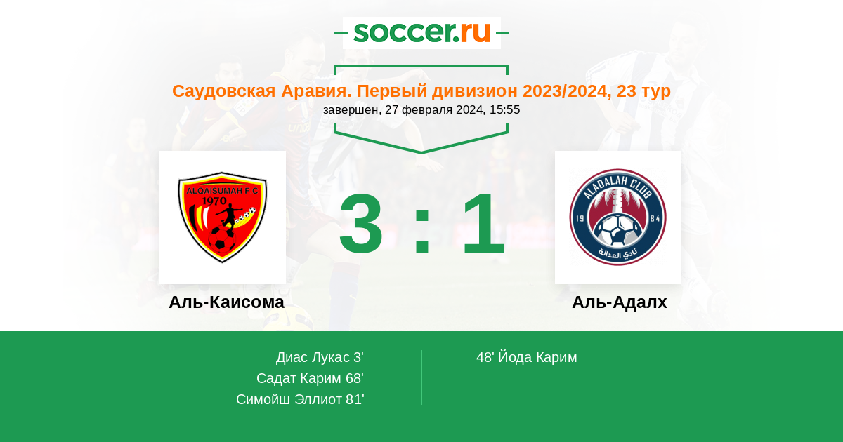 Аль-Каисома уверенно стоит на вылет, команда хуже всех играет на своем поле. Аль-Адалх вполне уверенно держится в середине таблицы, неплохо играя на выезде. Вся статистика за победу Аль-Адалх на чужом поле.