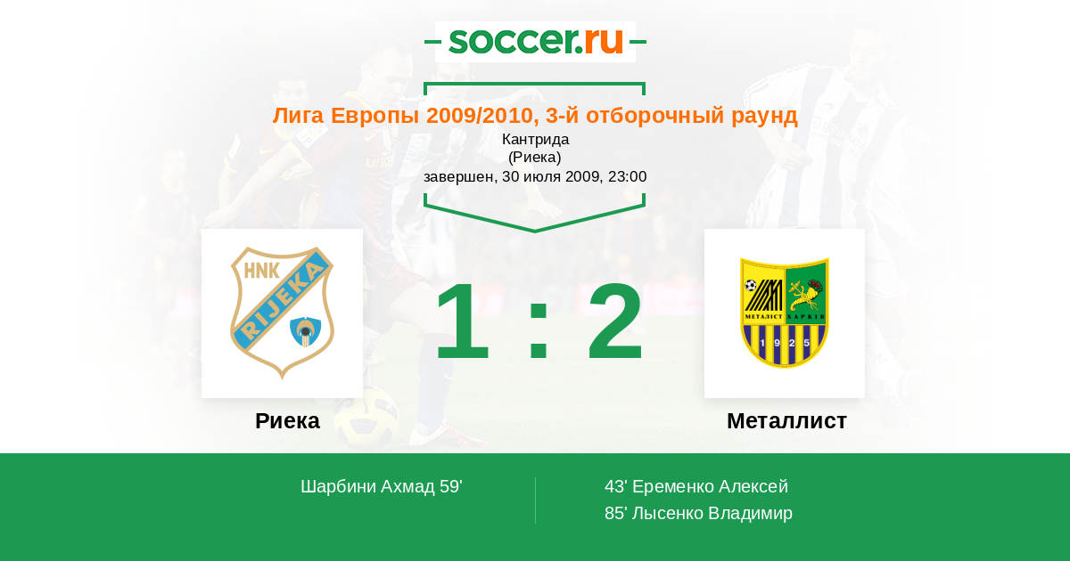 Протокол матча Риека против Металлист