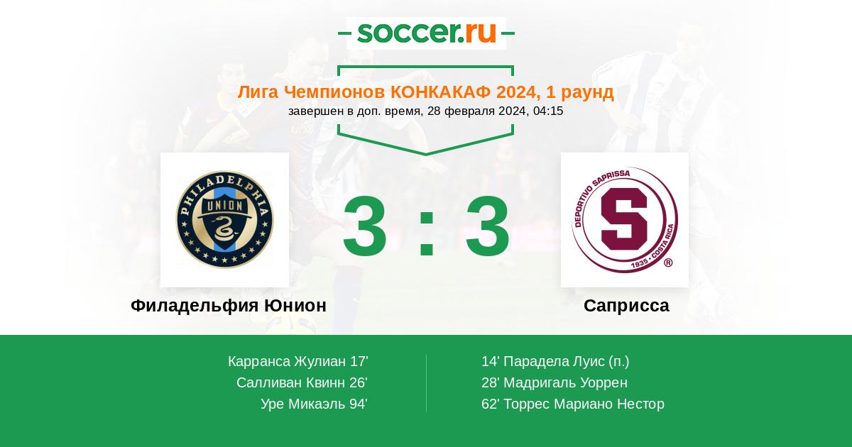Протокол матча Филадельфия Юнион против Саприсса