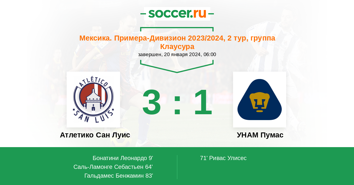 Протокол матча Атлетико Сан Луис против УНАМ Пумас