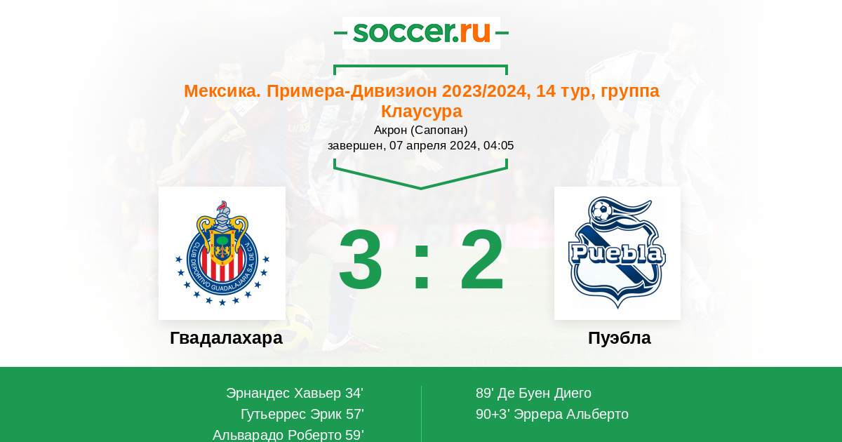 Протокол матча Гвадалахара против Пуэбла