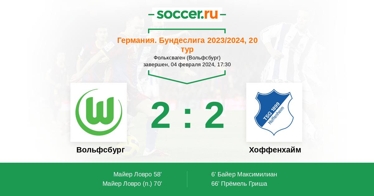 Протокол матча Вольфсбург против Хоффенхайм
