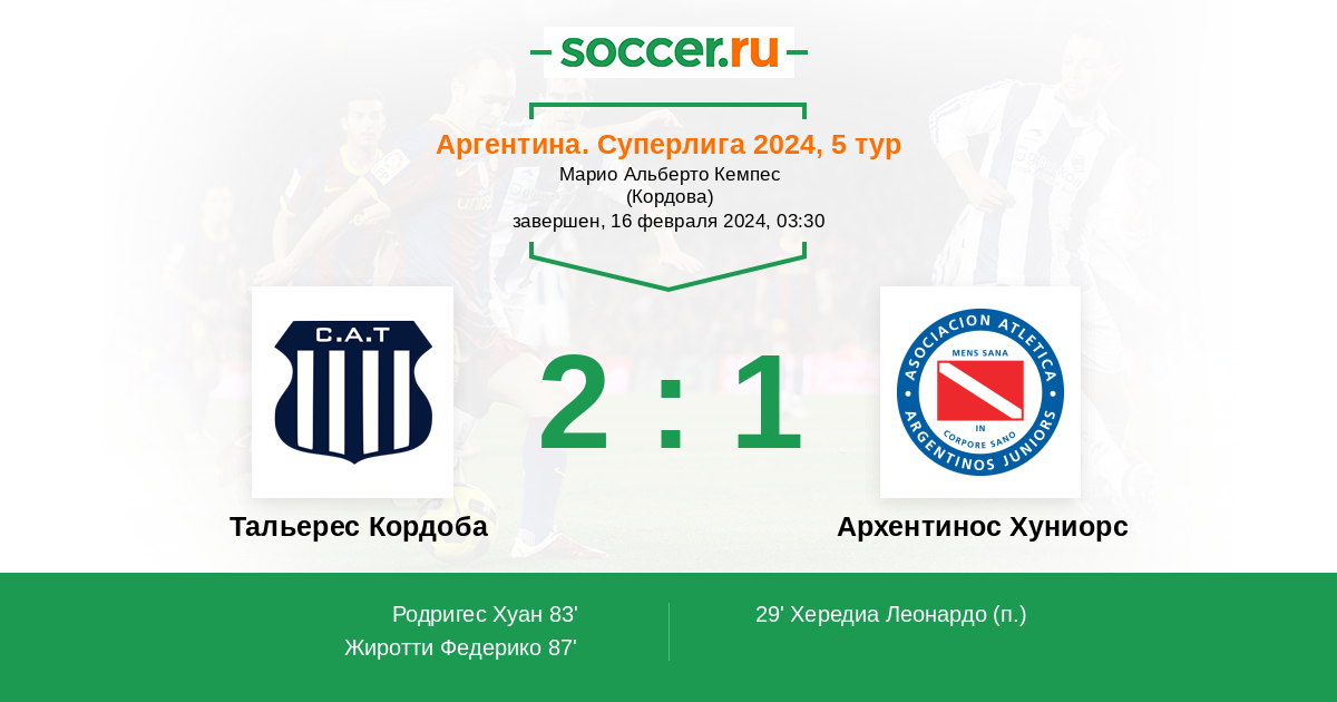Протокол матча Тальерес Кордоба против Архентинос Хуниорс