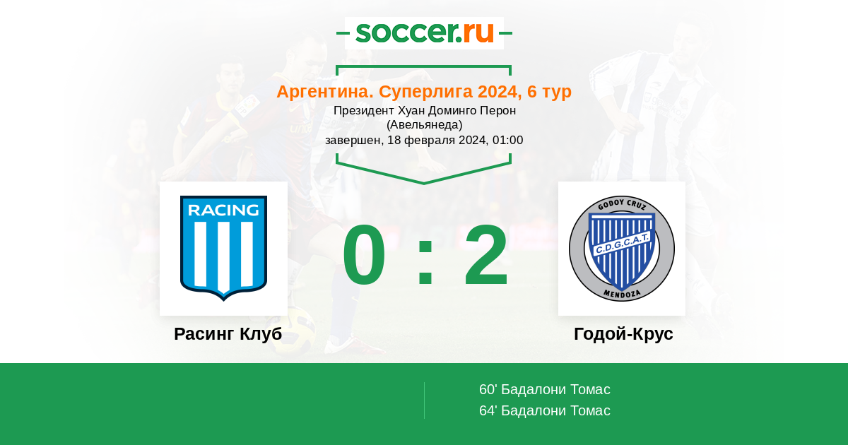 Протокол матча Расинг Клуб против Годой-Крус