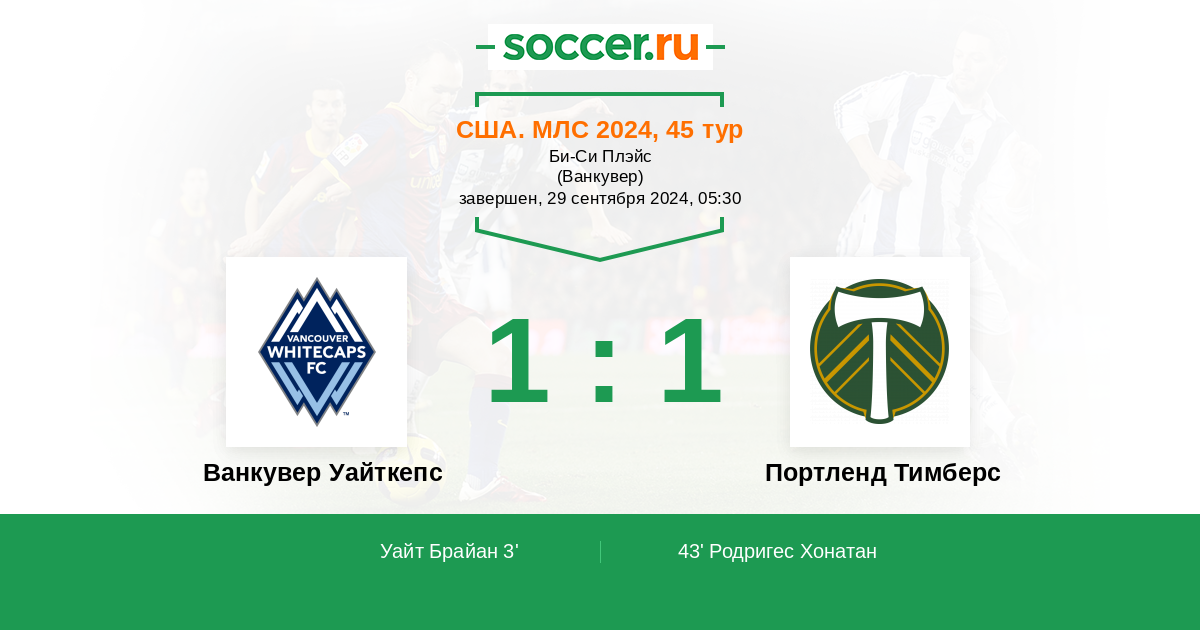 Протокол матча Ванкувер Уайткепс против Портленд Тимберс