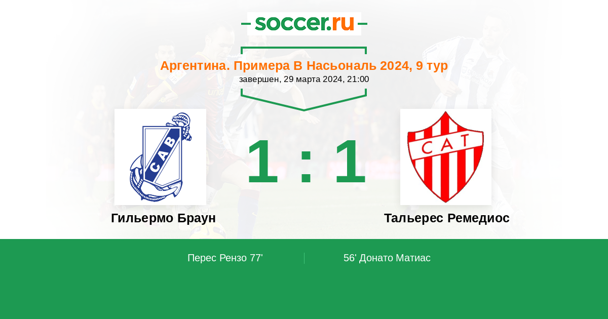 Протокол матча Гильермо Браун против Тальерес Ремедиос