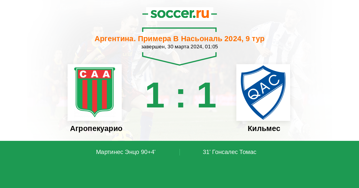 Протокол матча Агропекуарио против Кильмес