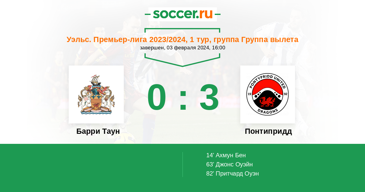 Протокол матча Барри Таун против Понтипридд