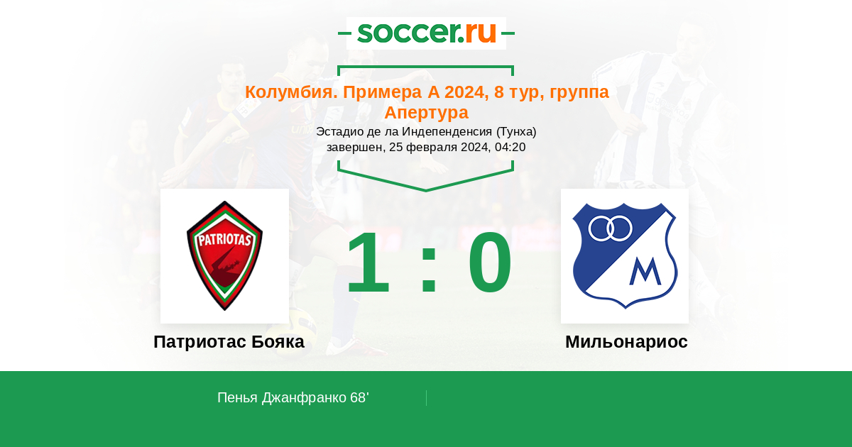 Протокол матча Патриотас Бояка против Мильонариос