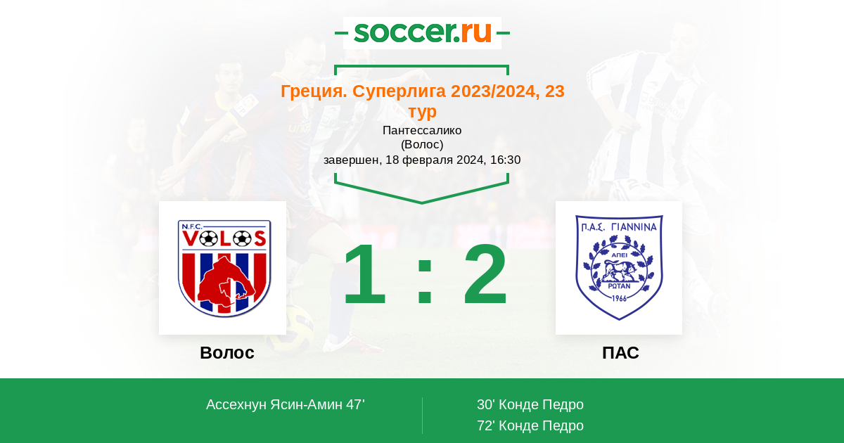 72' (1:2) Конде Педро (9) (Киакос Яннис (30))