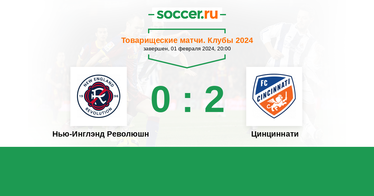 Товарищеские матчи. Клубы 15.02.2024 Цинциннати Логотип футбольный клуб Цинциннати 5:2 Логотип футбольный клуб Нью-Инглэнд Революшн (Фоксборо) Нью-Инглэнд Революшн
