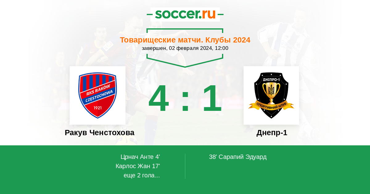 Протокол матча Ракув Ченстохова против Днепр-1