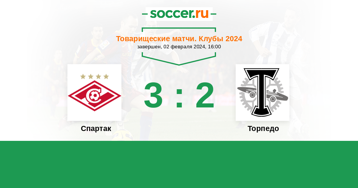 Товарищеские матчи. Клубы 20.02.2025 Спартак Логотип футбольный клуб Спартак (Москва) 2:1 Логотип футбольный клуб Торпедо (Москва) Торпедо