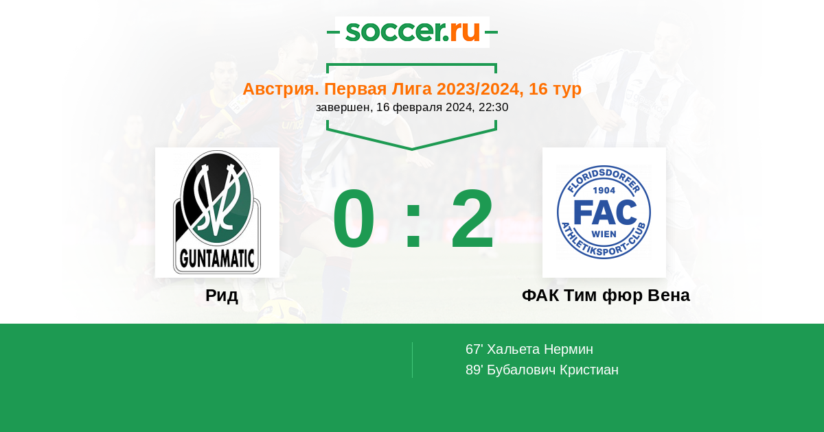 Протокол матча Рид против ФАК Тим фюр Вена