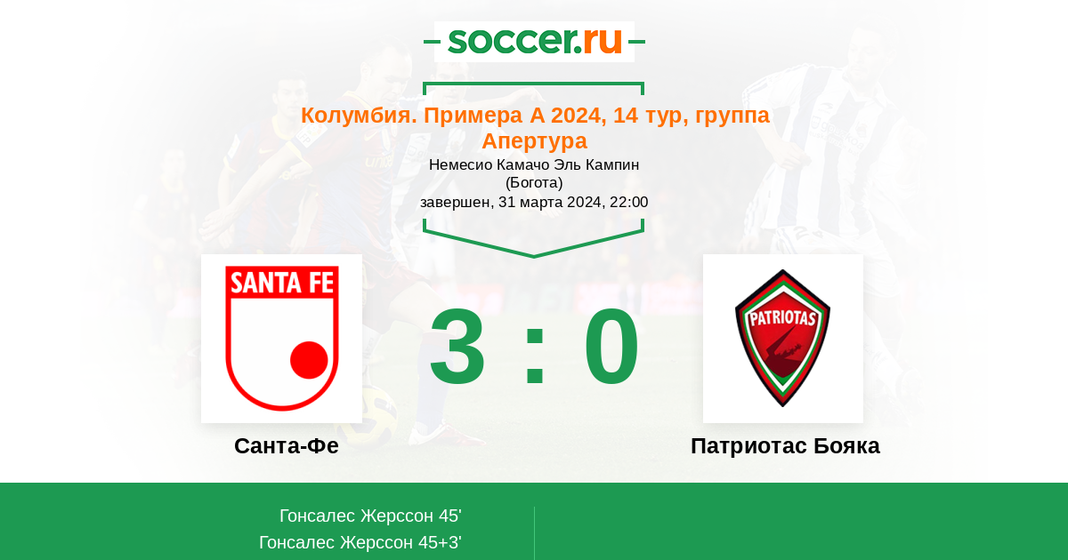 Протокол матча Санта-Фе против Патриотас Бояка